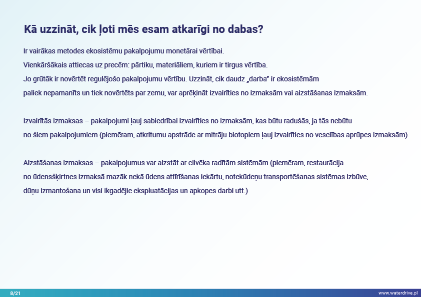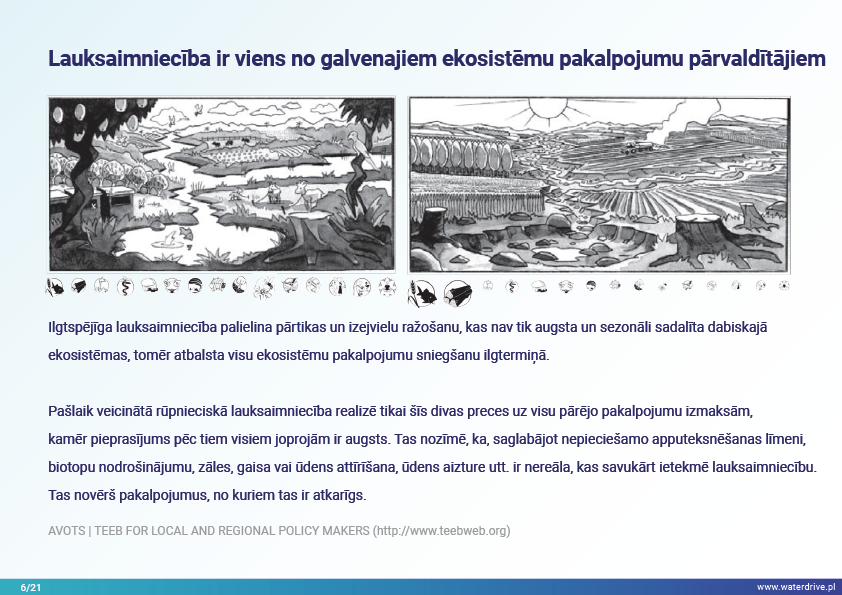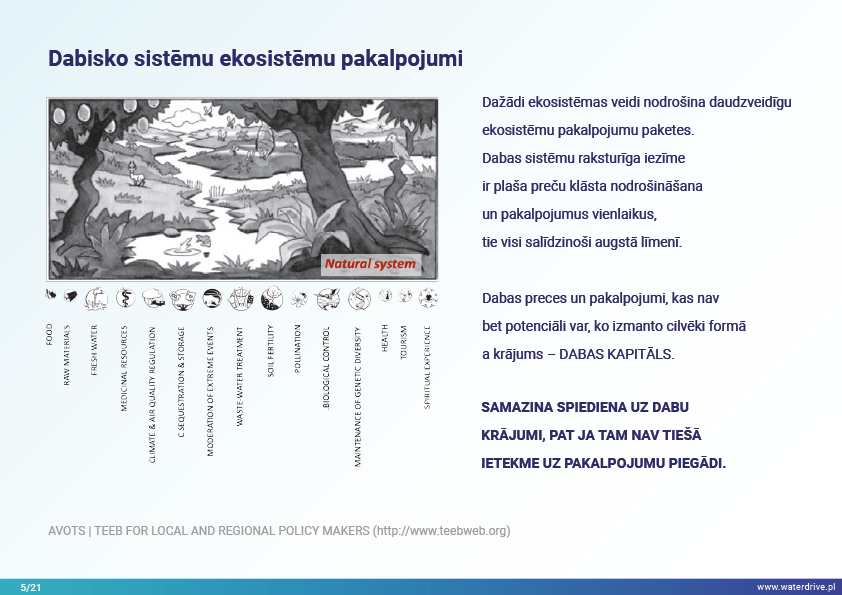Mūsu izdzīvošana ir atkarīga no spējas atjaunot un aizsargāt ekosistēmas tādā mērogā, kas nodrošina zemāku, bet stabilu un ilgtermiņa preču un pakalpojumu ražošanu no dabas. Tas prasa ekosistēmu pakalpojumu kartēšanu un novērtēšanu, kā arī politikas un pārvaldības karsto punktu definēšanu.