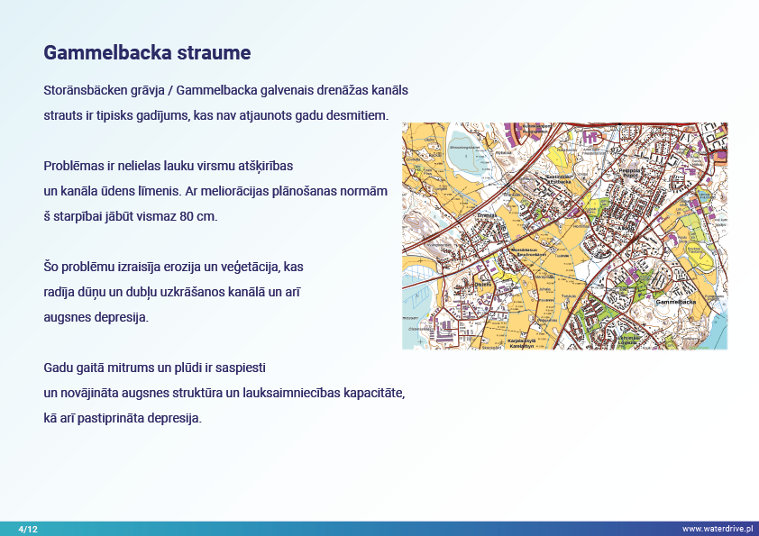 Storänsbäcken grāvja / Gammelbacka strauta (Somija) galvenais meliorācijas kanāls ir tipisks gadījums, kas nav atjaunots gadu desmitiem. Maģistrālā kanāla sliktais stāvoklis apgrūtināja zemnieku darbu, jo plūdi un slapjums aizkavēja sējus, apgrūtināja ražas novākšanu, samazināja ražu un sabojāja augsnes struktūru.