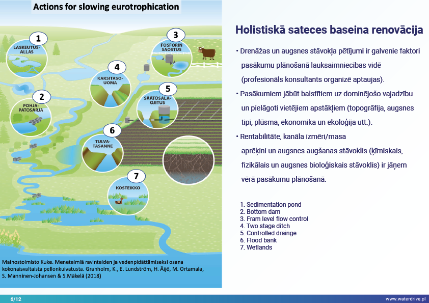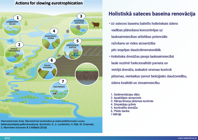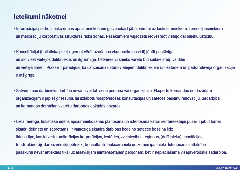 Holistiskās ūdens apsaimniekošanas ieviešana sateces baseina mērogā, iespējams, garantē labāko iespējamo rezultātu gan drenāžas, gan augsnes struktūras uzlabošanai un barības vielu zudumu samazināšanai ūdenstilpēs, ņemot vērā bioloģisko daudzveidību, ūdens kvalitāti un zivsaimniecību.