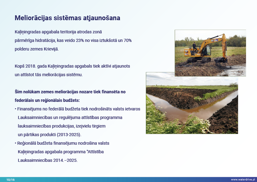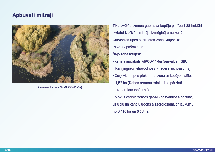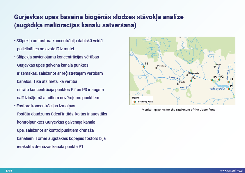 Guryevka upe (Mühlen Fluss) ir neliela upe Kaļiņingradas apgabalā, kuras galvenie piesārņojuma avoti ir cilvēku apmetnes, rūpniecības uzņēmumi un lauksaimniecība. Waterdrive projekta laikā tika veikts ūdens kvalitātes monitorings, kas parādīja, ka slāpekļa un fosfora koncentrācija palielinās, upei plūstot no iztekas līdz grīvai. Tika prezentēti mākslīgo mitrāju būvniecības priekšizpētes rezultāti, kā arī notiekošās aktivitātes saistībā ar meliorācijas sistēmas atjaunošanu. Lai veicinātu izpratni par mūsdienu agrovides pasākumiem, tika rīkotas daudzas konferences, sanāksmes un "apaļie galdi".