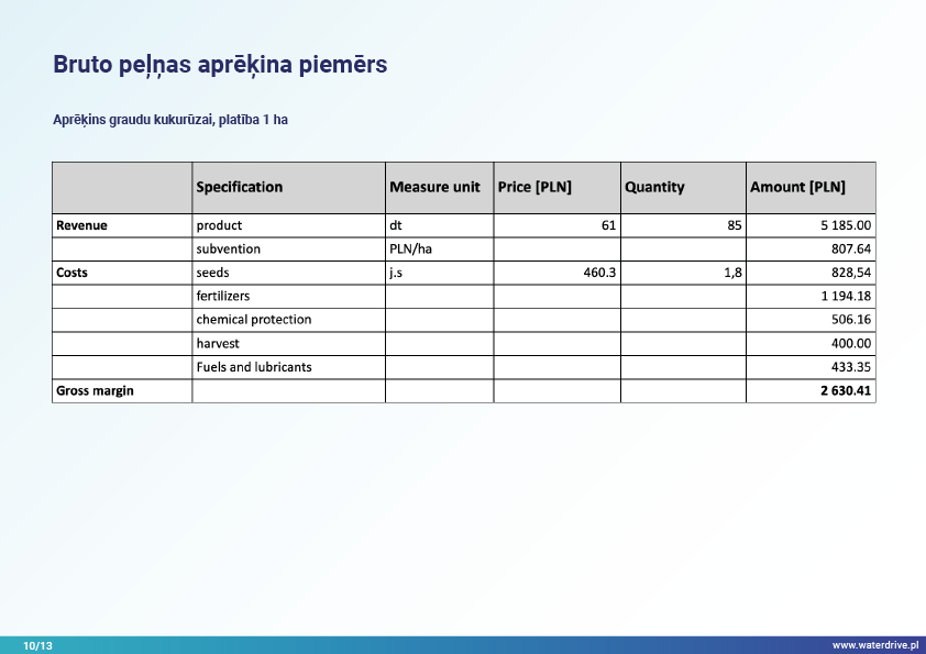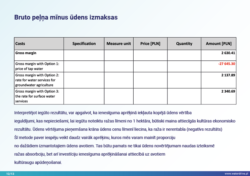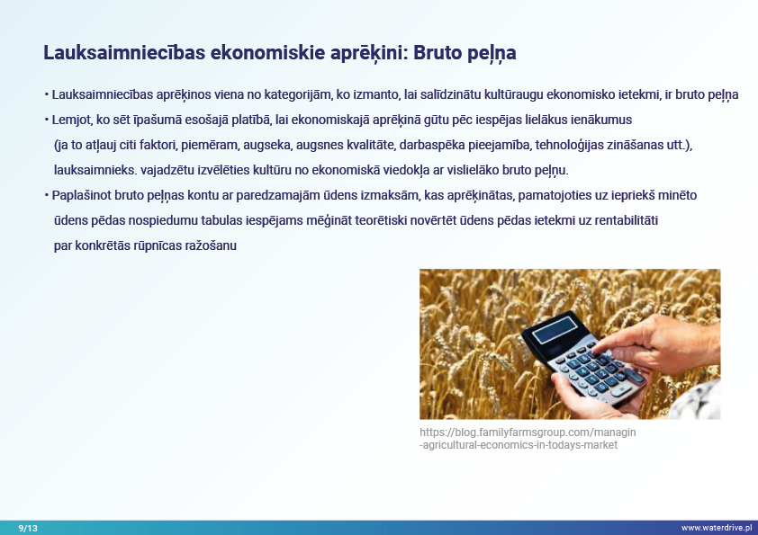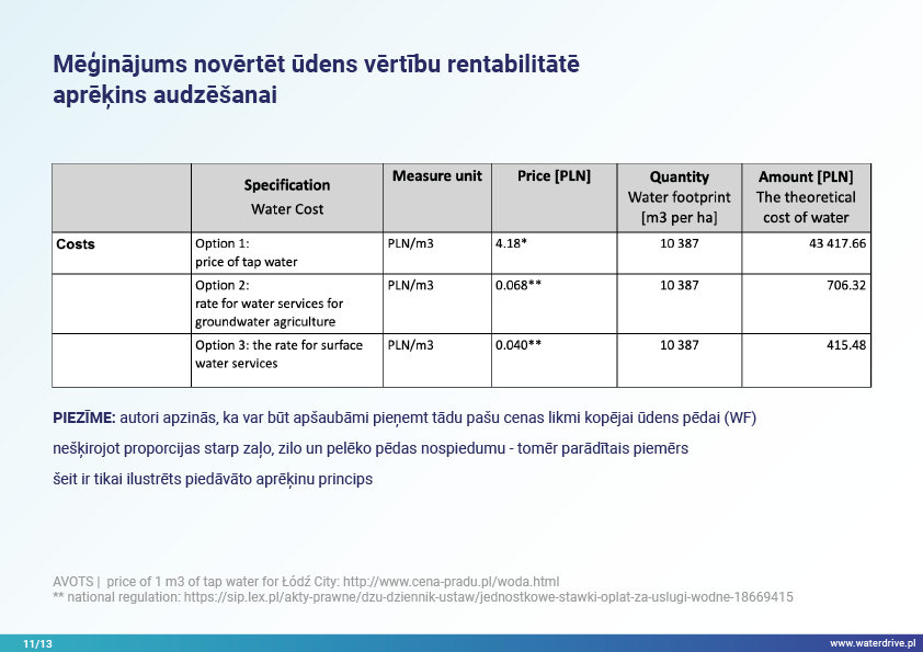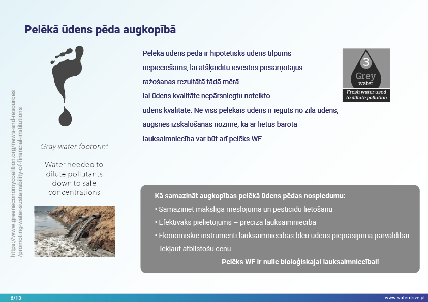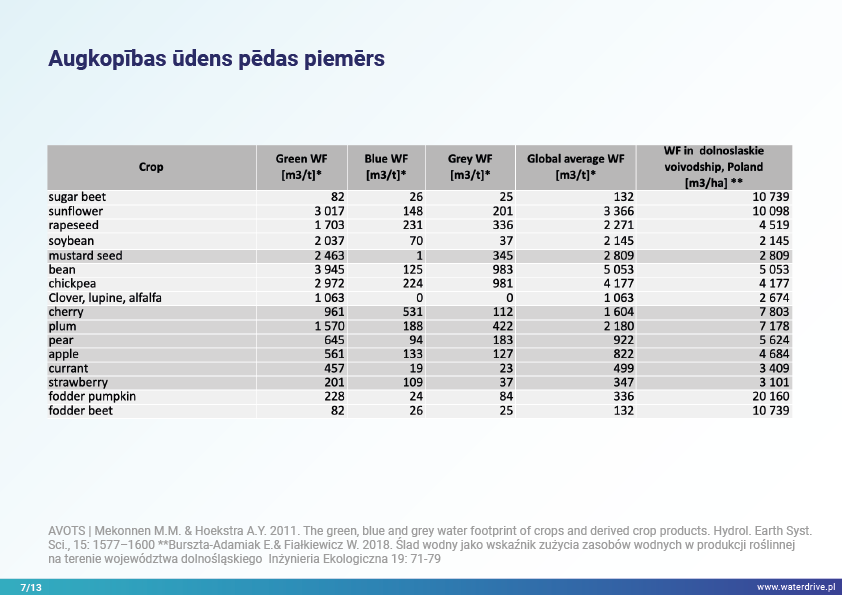 Prezentācijā mēs identificējam iespējas samazināt ūdens pēdas nospiedumu augkopībā ar zaļo (lietus ūdens izmantošana), zilo (ūdens tiek ņemts no virszemes un gruntsūdeņiem apūdeņošanai) un pelēko ūdens pēdu (ūdens, ko izmanto lauksaimniecības piesārņotāju atšķaidīšanai). Turklāt ir ierosināts veids, kā ekonomiskajos aprēķinos iekļaut lauksaimniecībā izmantojamo ūdeni, paplašinot tiešo pārpalikuma kontu, iekļaujot aplēstās ūdens izmaksas.