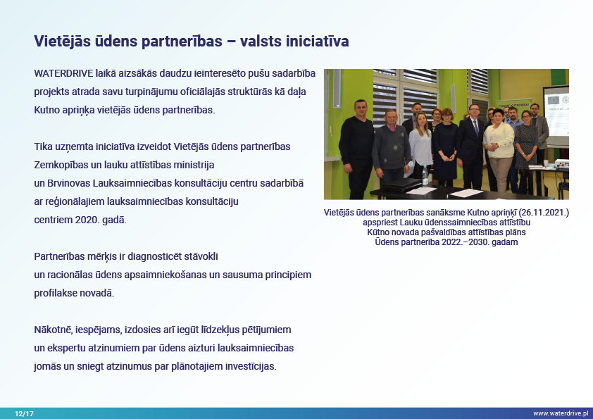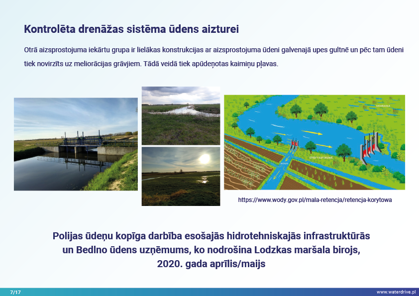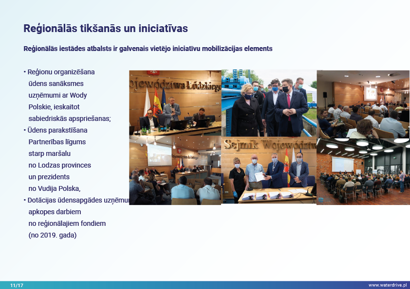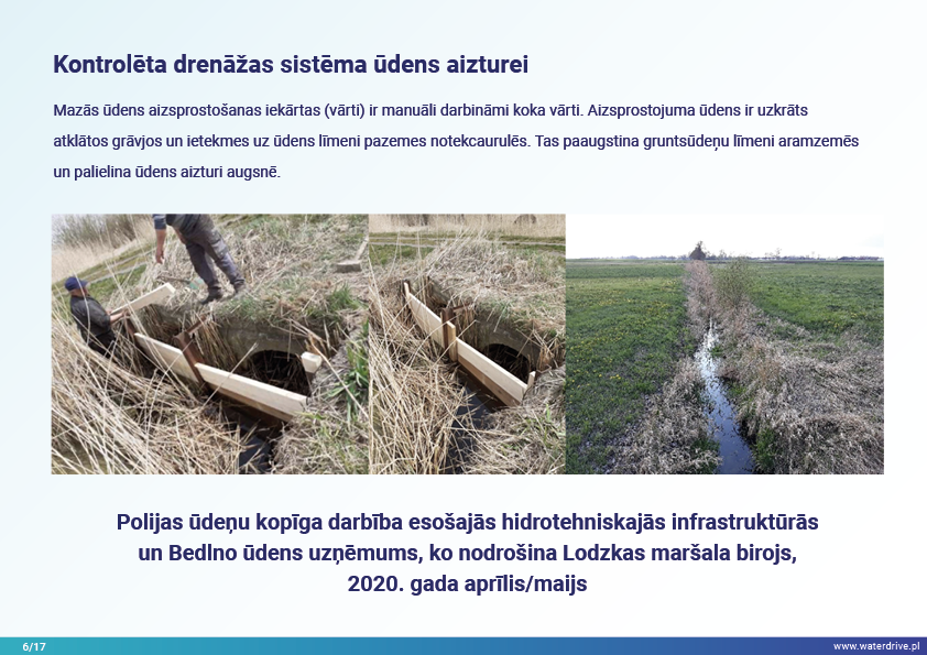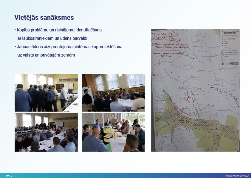 Mēs iepazīstinām ar progresu vietējā daudzu ieinteresēto personu sadarbībā, lai palielinātu ūdens aizturi, kurā galvenie dalībnieki ir ūdens uzņēmumi (brīvprātīga lauksaimnieku apvienība) un National Water Holding Wody Polskie. Reģionālās un nacionālās iniciatīvas ir spēcīgi veicinājušas vietējās darbības.