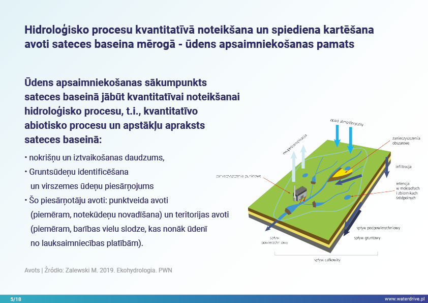 Šajā prezentācijā mēs izskaidrojam sateces baseina (upes baseina) jēdzienu, kā arī dažādus procesus, kas veido ūdens ciklu. Mēs piedāvājam arī trīs soļus ūdens apsaimniekošanā, kas balstās uz ekohidroloģijas principiem (Zalewski 2002), kas paredz "duālo regulēšanu" - ūdens cikla regulēšanu, veidojot biotu un regulējot biotiskos procesus, un otrādi, uzlabojot biotu, regulējot hidroloģiju. Iesniegtā labā prakse parāda, kā varam ietekmēt ūdens aiztures palielināšanos un barības vielu noteces samazināšanos ainavā, augsnē, meliorācijas sistēmā, virszemes ūdeņos un seklā gruntsūdeņu līmenī. Šis ir aicinājums uz vairākām prezentācijām!