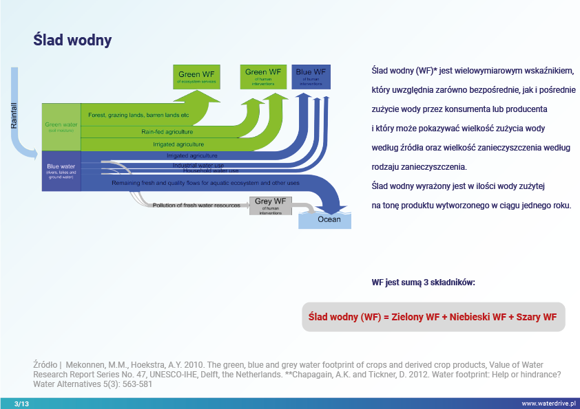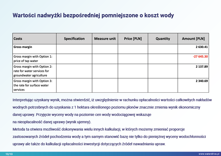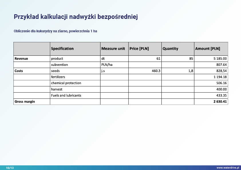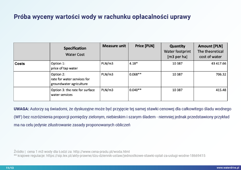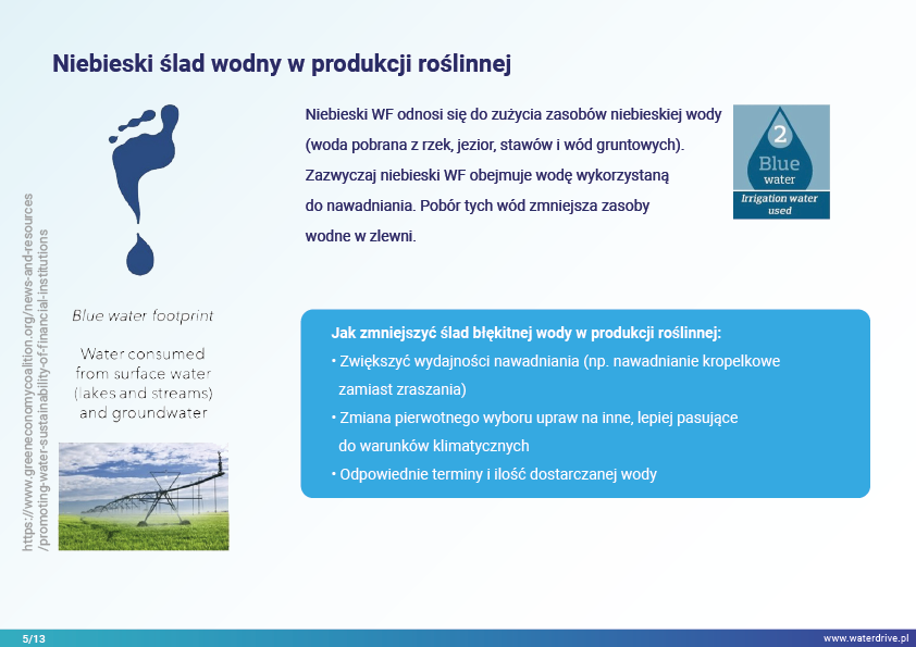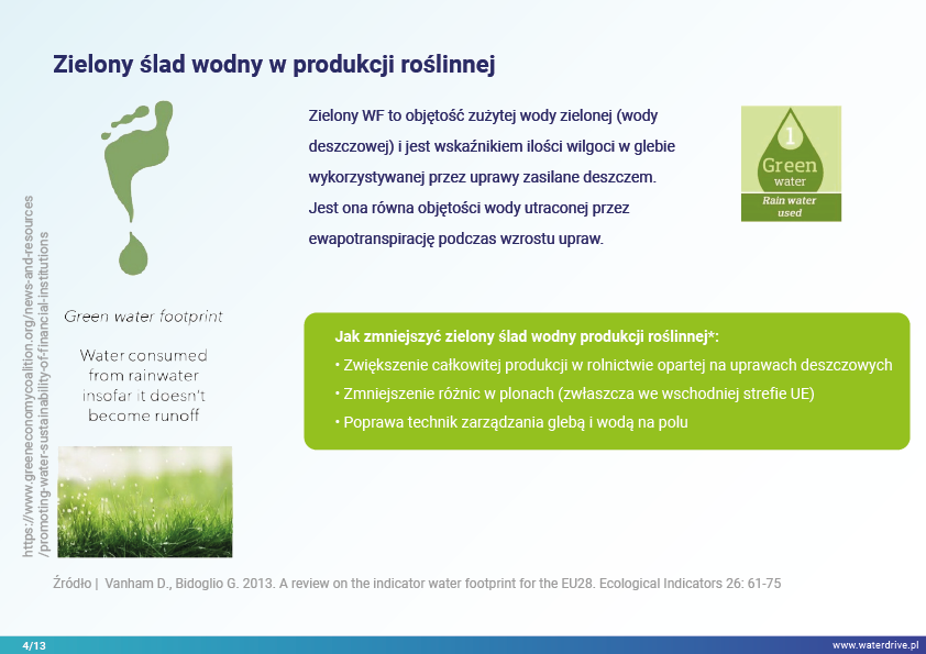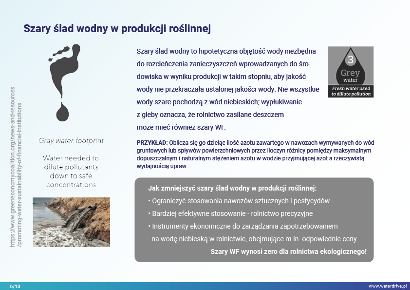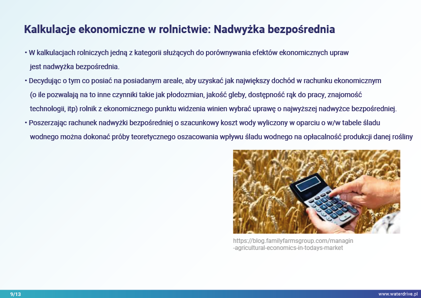W prezentacji wskazujemy na możliwości zmniejszenia śladu wodnego w produkcji roślinnej w podziale na zielony (wykorzystanie wody opadowej), niebieski (woda czerpana z wód powierzchniowych i gruntowych do nawodnień) oraz szary ślad wodny (woda wykorzystana do rozcieńczenia rolniczych zanieczyszczeń). Ponadto został zaproponowany sposób uwzględnienia wody w rolnictwie w kalkulacjach ekonomicznych poszerzając rachunek nadwyżki bezpośredniej o szacunkowy koszt wody.