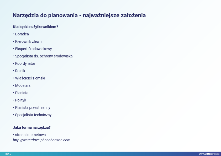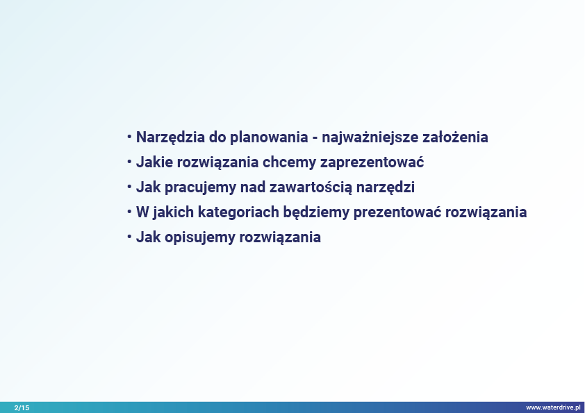 Planning toolbox, stanowiący katalog ciekawych rozwiązań, dostarcza wiedzę na temat możliwości wykorzystania procesów planistycznych w poprawie zarządzania gospodarką wodną