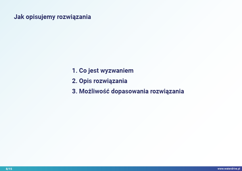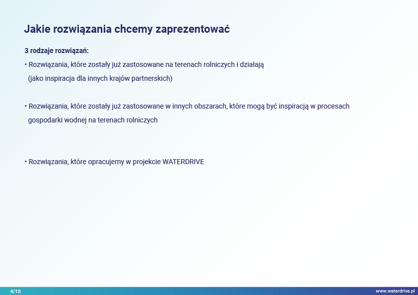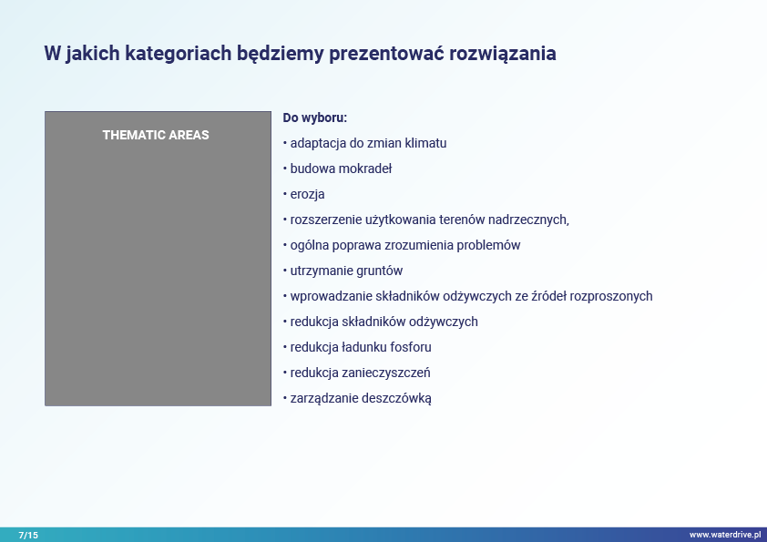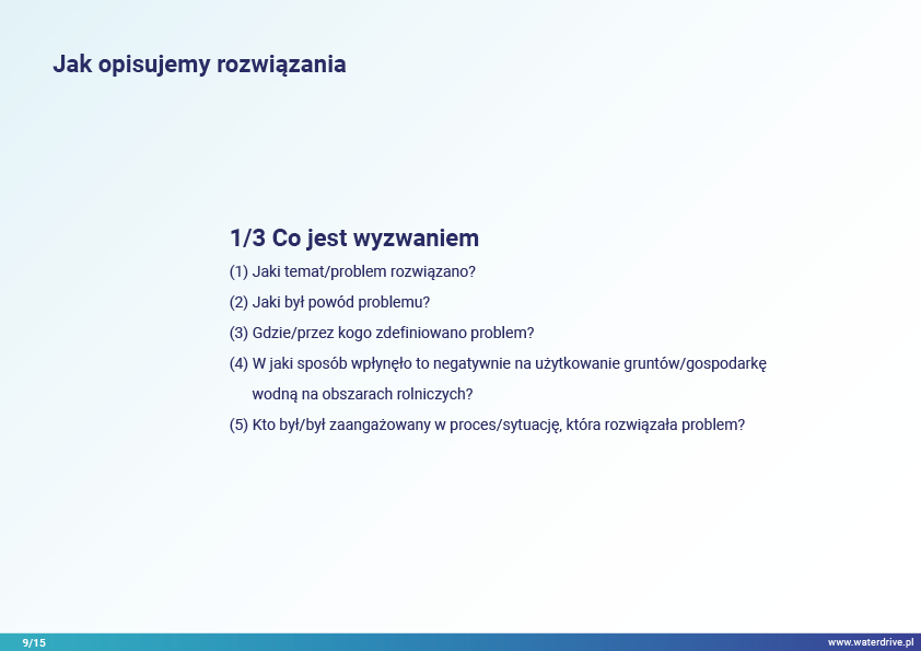 Rozwiązania oparte są na przykładach i obejmują różne obszary tematyczne w procesie planowania przestrzennego na gruntach rolnych w kontekście osiągania oczekiwanych wskaźników środowiskowych związanych z gospodarką wodną.