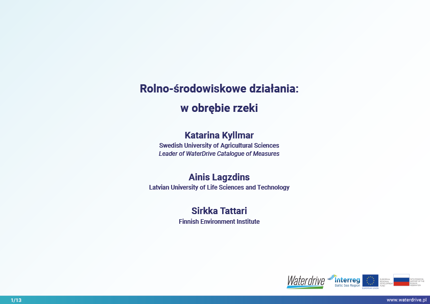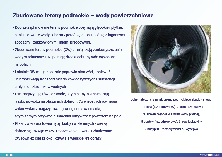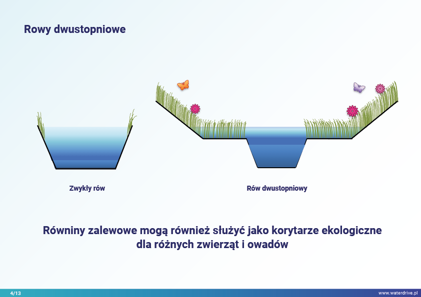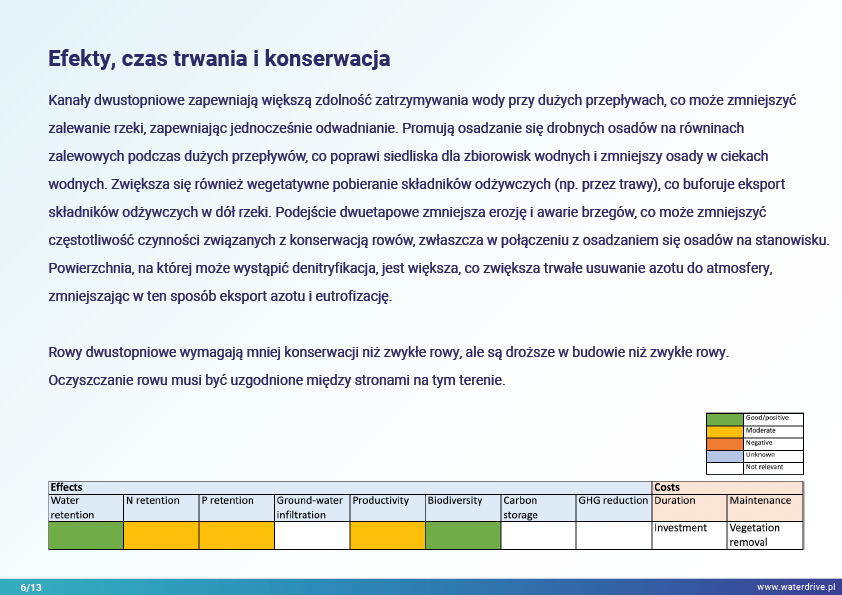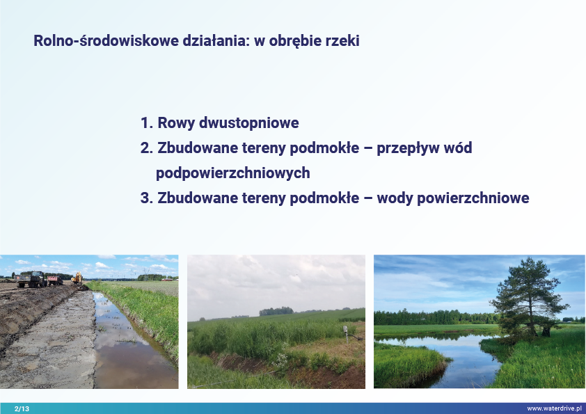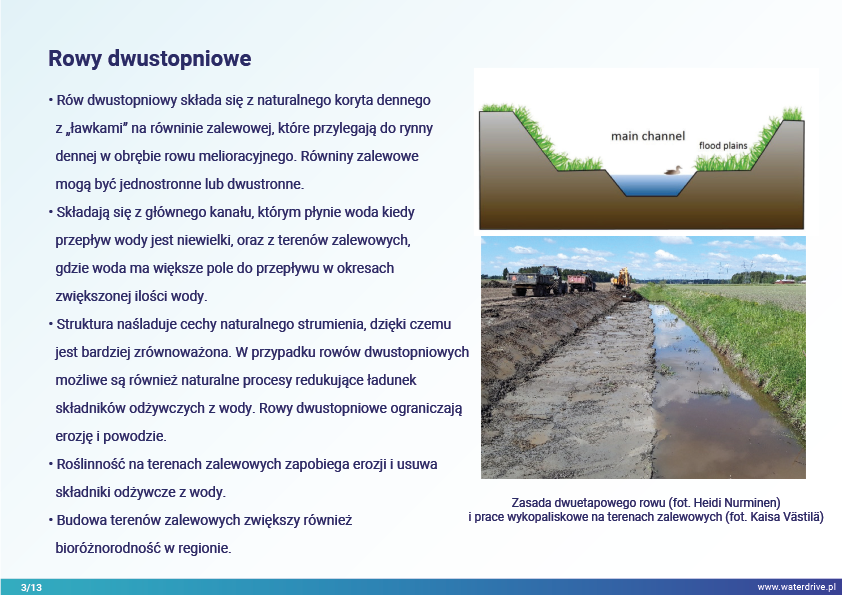 Ostatnia grupa działań zaprezentowana w the Waterdrive Catalogue of Measures (https://www.slu.se/waterdrive) to działania rolno-środowiskowe związane bezpośrednio z ekosystemami wodnymi: dwudzielne koryta i sztuczne mokradła. Przebudowa kanałów lub uregulowanych cieków polegająca na wyznaczeniu głównego kanału oraz taras zalewowych służy ochronie przed powodzią i suszą, samooczyszczaniu rzek i zwiększeniu bioróżnorodności.