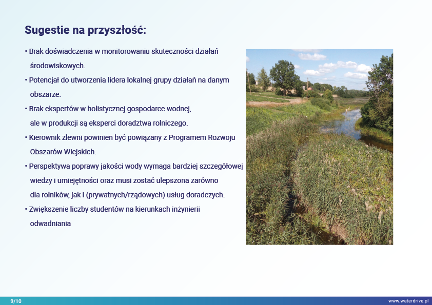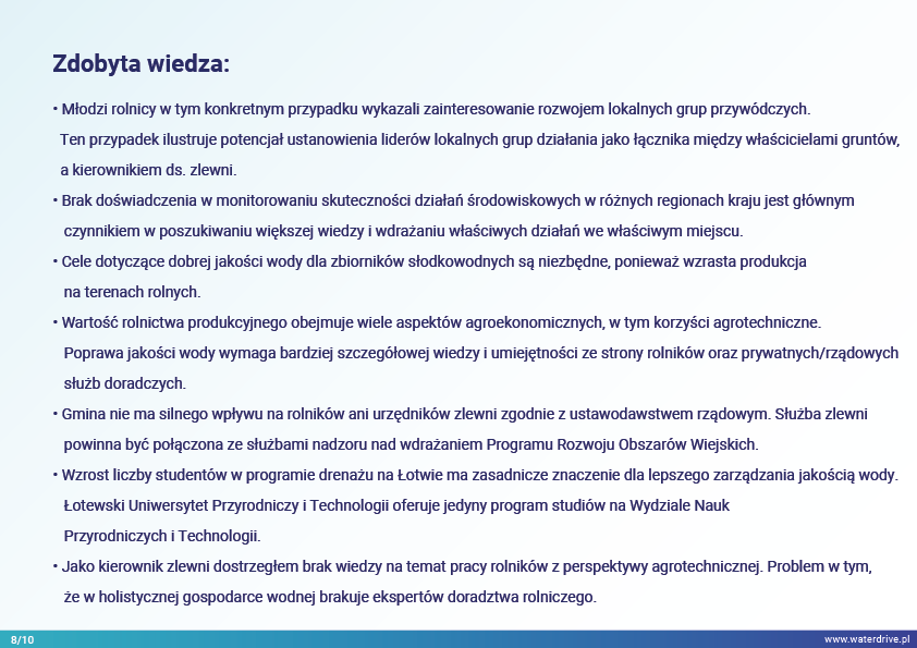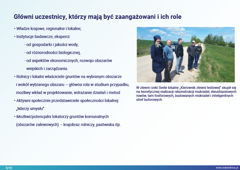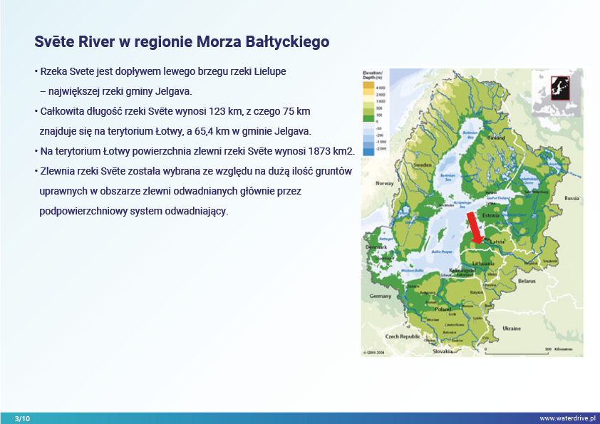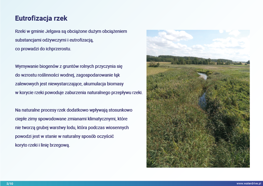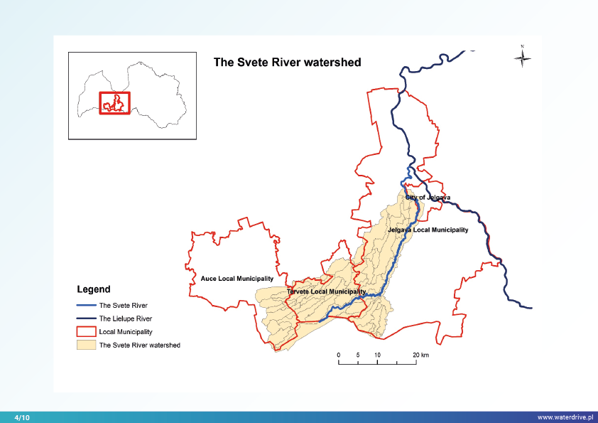 Rzeki w gminie Jelgava (Łotwa) znajdują się w trudnej sytuacji z powodu wysokiego obciążenia substancjami odżywczymi i eutrofizacji, która prowadzi do zarastania rzek. W ramach projektu Waterdrive, w zlewni rzeki Svete, lokalny „pilotażowy doradca ds. wody” pracował nad potencjalnym wdrożeniem takich działań jak: odtworzenia mokradeł, dwudzielne kanały, zapory fosoforwe czy też zbudowanych sztucznych mokradeł oraz inteligentnych stref buforowych.