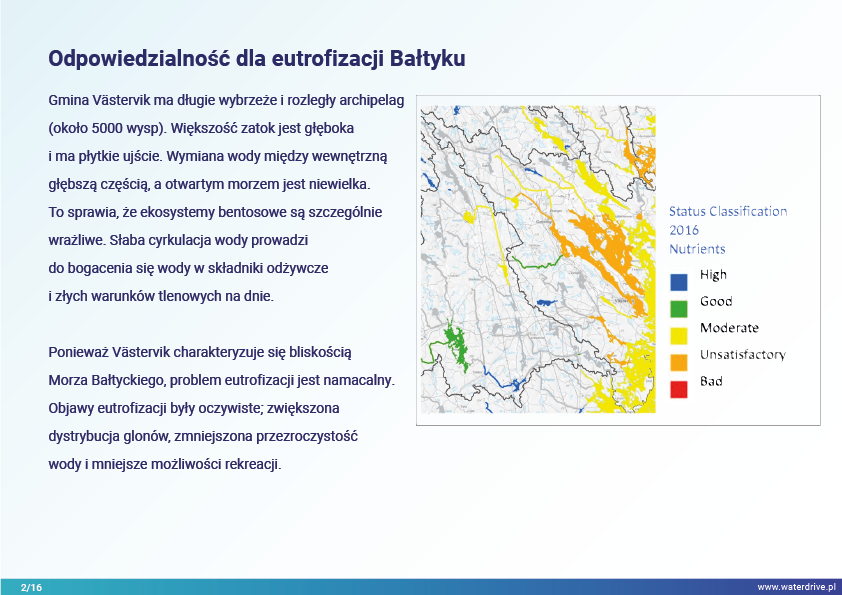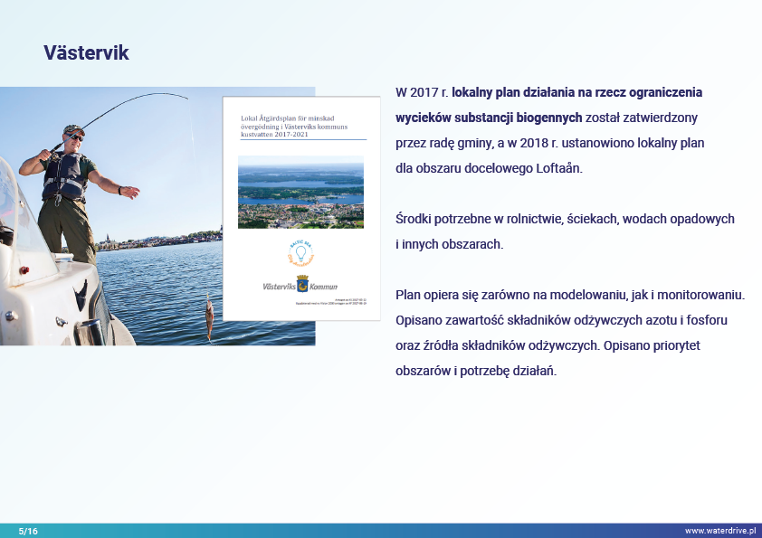 Gmina Västervik (Szwecja) ma długie wybrzeże i rozległy archipelag na Morzu Bałtyckim. W 2017 r. zatwierdzono Lokalny plan działania na rzecz ograniczenia strat substancji biogennych w celu zmniejszenia eutrofizacji Bałtyku. W Planie wskazano szereg działań naprawczych, które powinny być zastosowane w obszarach rolniczych (np. wapnowanie strukturalne, rowy filtracyjne, dwudzielne kanały, stawy fosforowe, tereny podmokłe i kontrolowane odwadnianie).