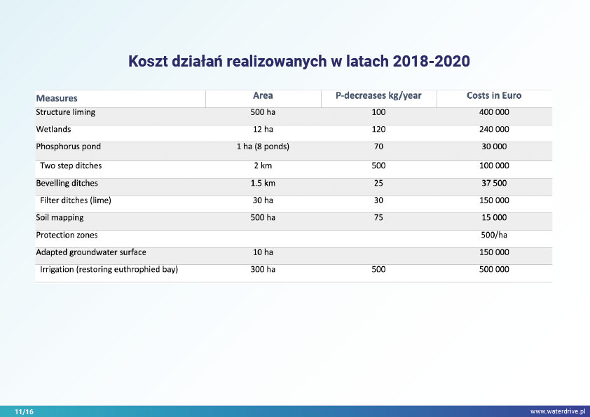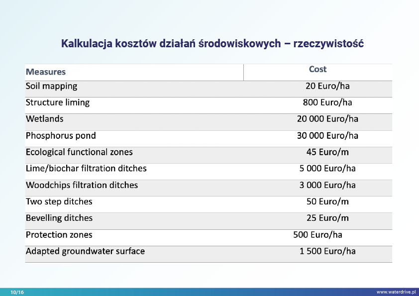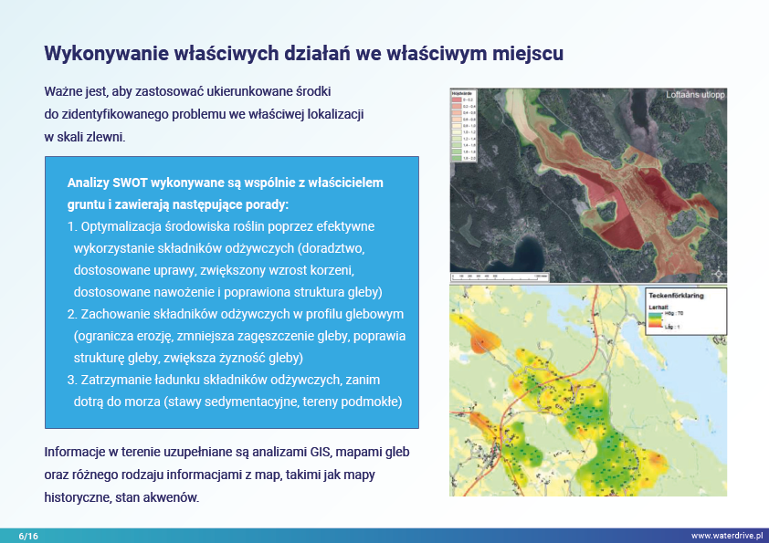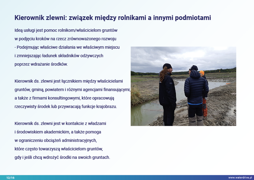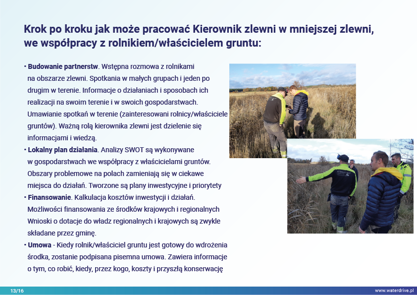 Działania dobrano do zidentyfikowanego problemu, a ich lokalizację wybrano jako optymalną w zlewni. Idea „Właściwe rzeczy we właściwym miejscu” inspiruje wszystkich partnerów projektu Waterdrive. Przedstawiono doświadczenia z pracy doradcy zlewniowego/wodnego we współpracy z rolnikami i właścicielami gruntów przy wdrażaniu planu działań.