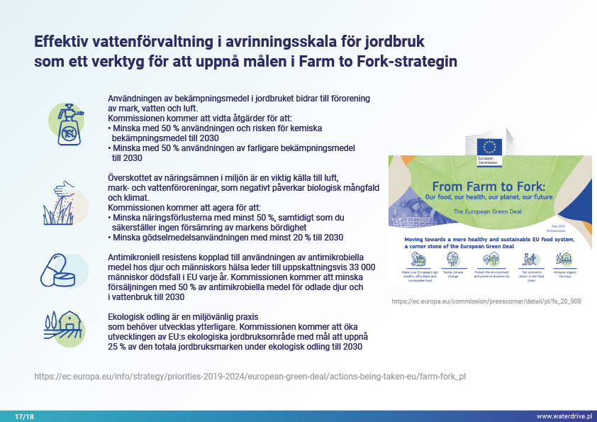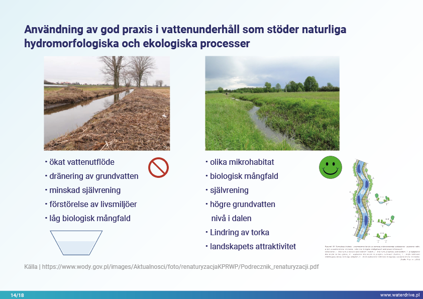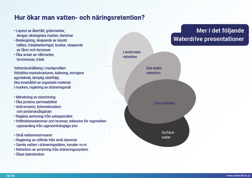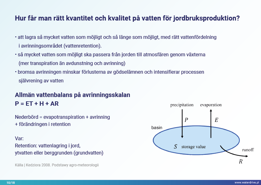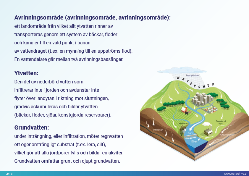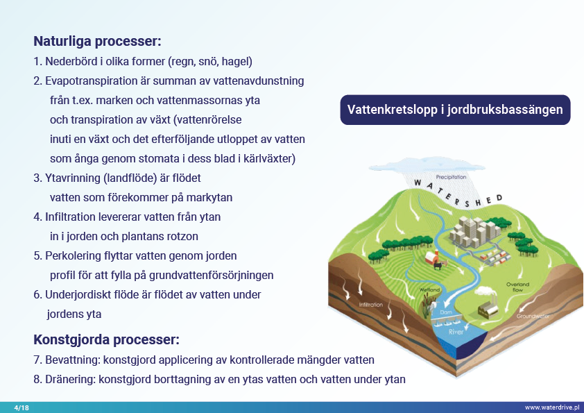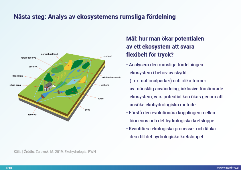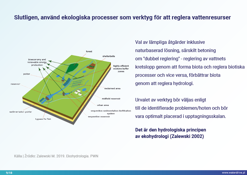 I denna presentation förklarar vi begreppet ett avrinningsområde (avrinningsområde) samt de olika processer som utgör vattnets kretslopp. Vi presenterar också tre steg i vattenförvaltning baserade på principerna för ekohydrologi (Zalewski 2002), som utgår från "dual-regulation" - reglering av vattnets kretslopp genom att forma biota och reglera biotiska processer och vice versa, förstärka biota genom att reglera hydrologi. Den presenterade goda praxisen visar hur vi kan påverka ökningen av vattenretention och minskning av näringsavrinning i landskapet, marken, avloppssystemet, ytvatten och grunda grundvattennivåer. Detta är en inbjudan till fler presentationer!