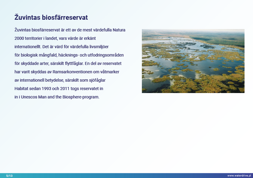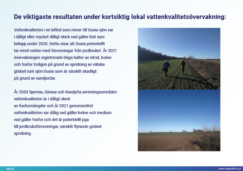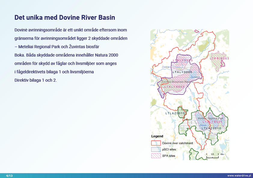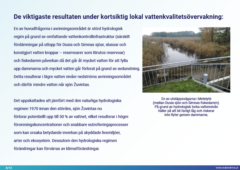 Dovinės avrinningsområde (Litauen) är ett unikt område eftersom inom avrinningsområdets gränser ligger två skyddade områden – Meteliai Regional Park och Žuvintas biosfärreservat. Under 1800- och 1900-talet genomfördes markåtervinnings- och våtmarksavvattningsprojekt i ärendeområdet i syfte att bygga ut jordbruksmarker. Analysen av kortsiktig lokal vattenkvalitetsövervakning visar bland annat fiskdammars inverkan på vattenkvaliteten. Vi presenterar också lärdomar från den lokala samarbetsinitieringsfasen.