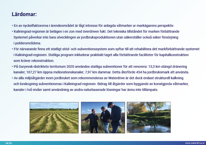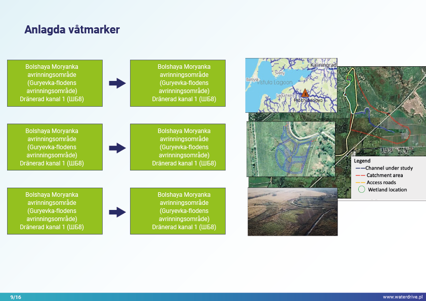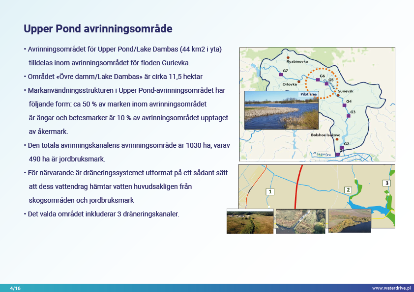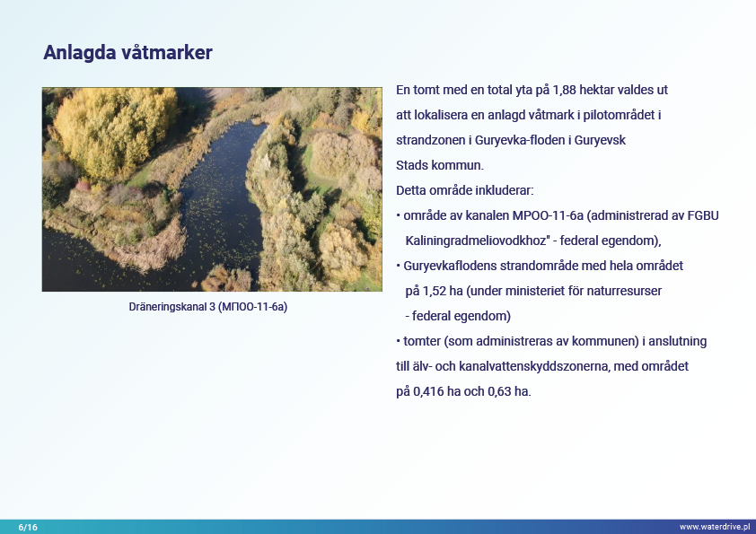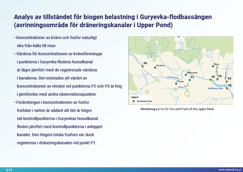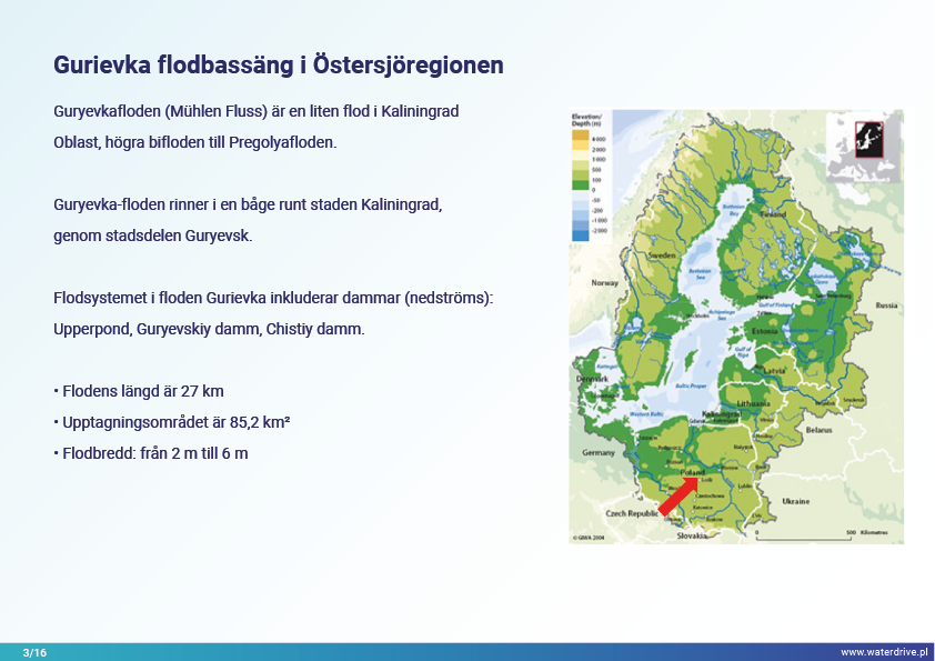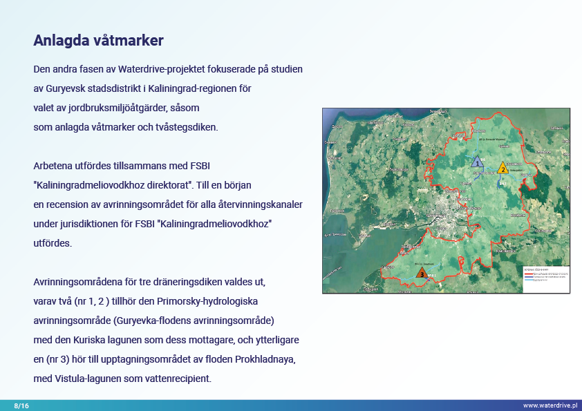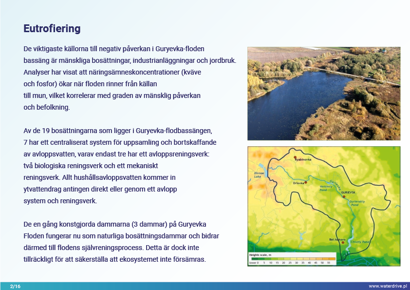 Guryevkafloden (Mühlen Fluss) är en liten flod i Kaliningradregionen vars främsta föroreningskällor är mänskliga bosättningar, industrianläggningar och jordbruk. Under Waterdrive-projektet genomfördes vattenkvalitetsövervakning och visade att kväve- och fosforhalterna ökar med flodens flöde från källan till mynningen. Resultaten av förstudien om anläggande av konstgjorda våtmarker presenterades, liksom de pågående aktiviteterna i samband med restaurering av markbehandlingssystem. Ett flertal konferenser, möten och "rundabordssamtal" hölls för att öka medvetenheten om moderna miljöåtgärder inom jordbruket.