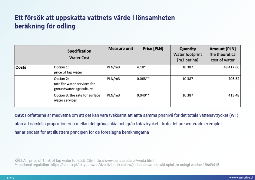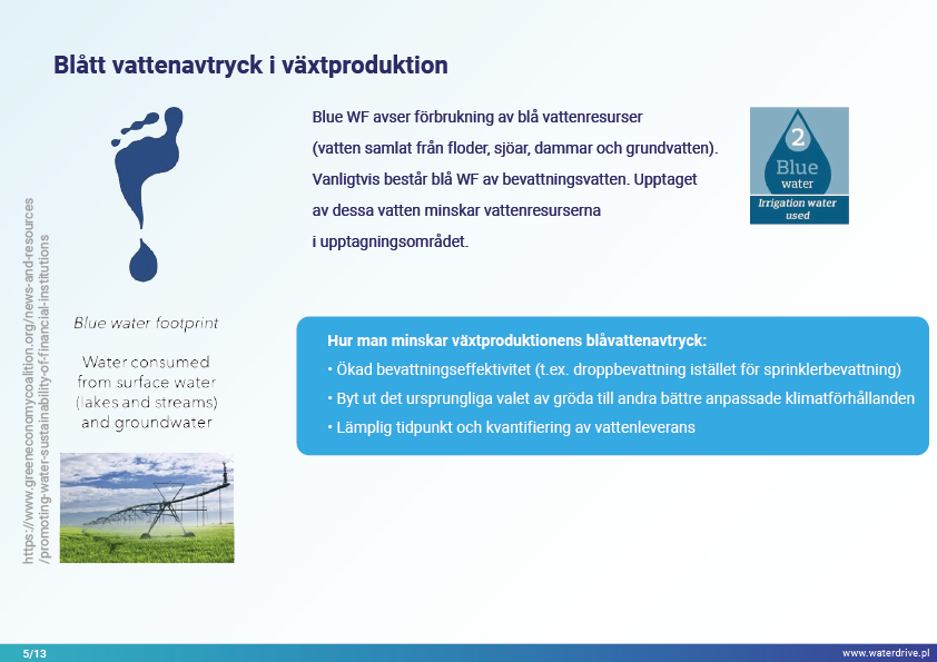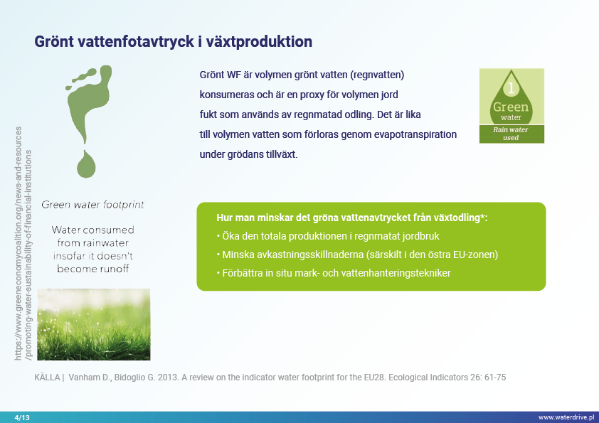I presentationen identifierar vi möjligheter att minska växtodlingens vattenavtryck genom grönt (regnvattenanvändning), blått (vatten som hämtas från yt- och grundvatten för bevattning) och gråvattenfotavtryck (vatten som används för att späda ut föroreningar från jordbruket). Dessutom har ett sätt att inkludera jordbruksvatten i ekonomiska kalkyler genom att utöka det direkta överskottskontot till att omfatta den beräknade kostnaden för vatten föreslagits.