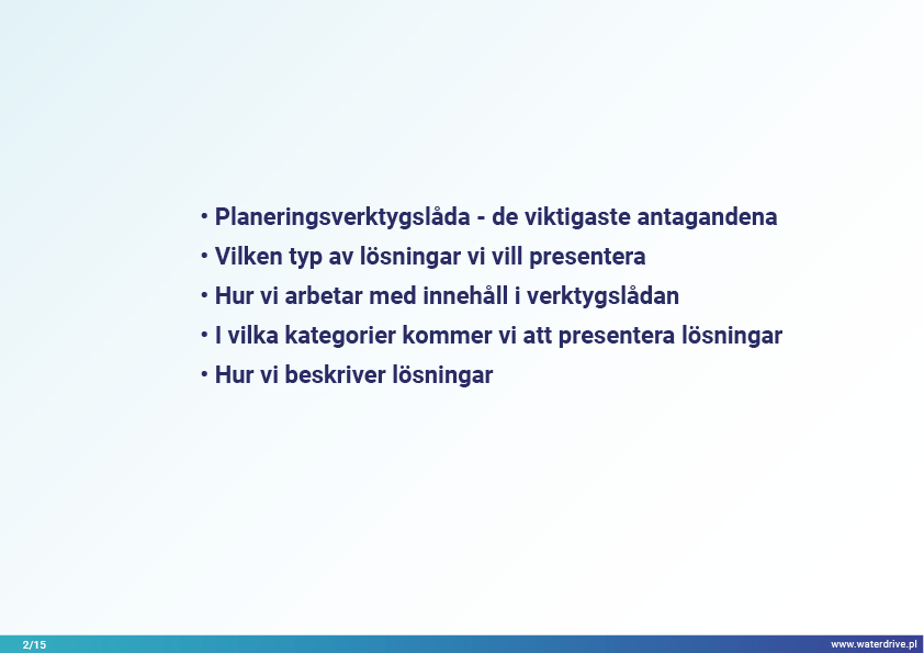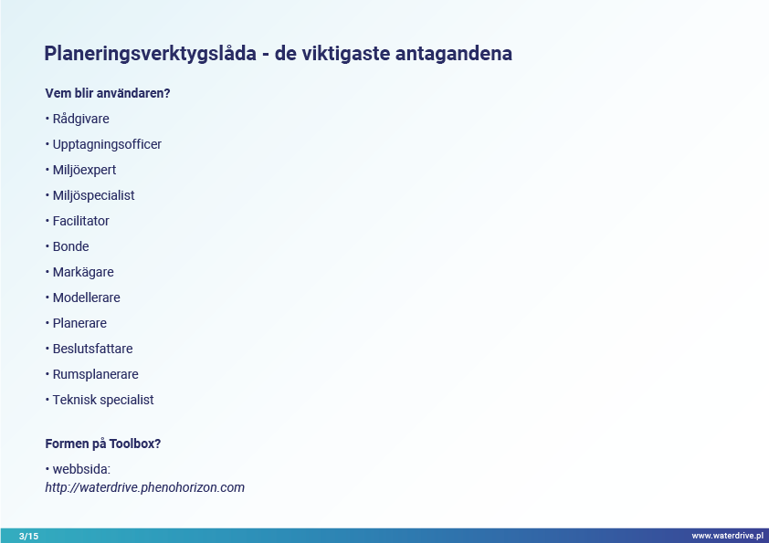 Planeringsverktygslådan (https://waterdrive.cdr.gov.pl) är en fritt tillgänglig webbplats för att lära sig om goda metoder för markanvändningsplanering, vilka verktyg som ska användas, hur man går djupare och vem man ska involvera i processen för att uppnå önskade miljöresultat samtidigt som sociala behov tillgodoses.